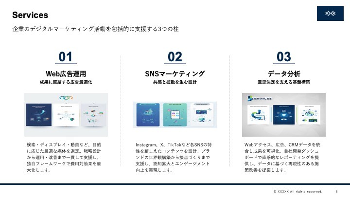 研修スライド、社内説明資料、広報説明資料など、 大量に発生するドキュメントを標準化して高速に作成。 部署横断の品質統制にも向いています。