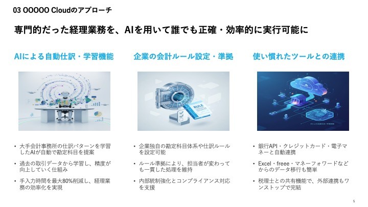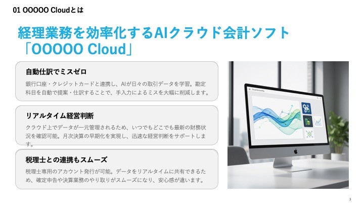 提案書、稟議書、会議資料、商品説明資料など、日常的に発生するスライド作成を AI が一貫して支援します