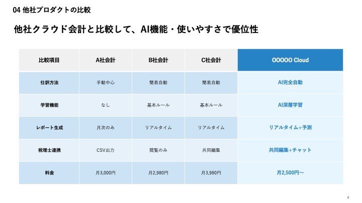 新規事業企画、サービス提案、競合分析レポートなど、 構成が複雑になりがちな資料づくりを自動化。 “うまい構成”を最初から手に入れられます。